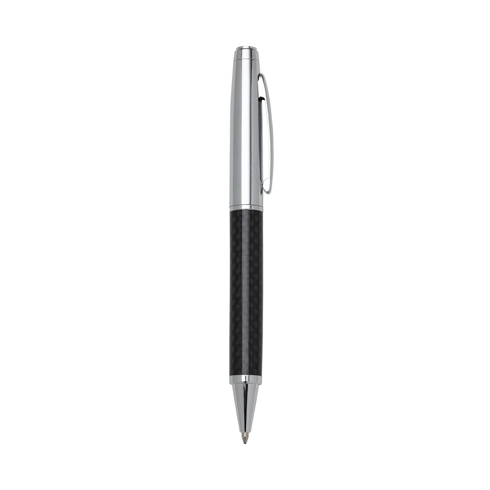 Caneta metálica com acabamento brilhante, versões em couro sintético e fibra preta.